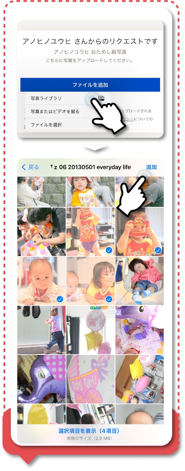 お名前とメールアドレスを入力して「アップロード」をタップ。あとはアップロードされるのをのんびり待てばできあがりです♪