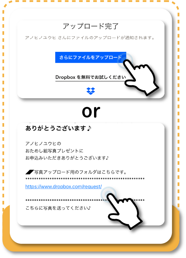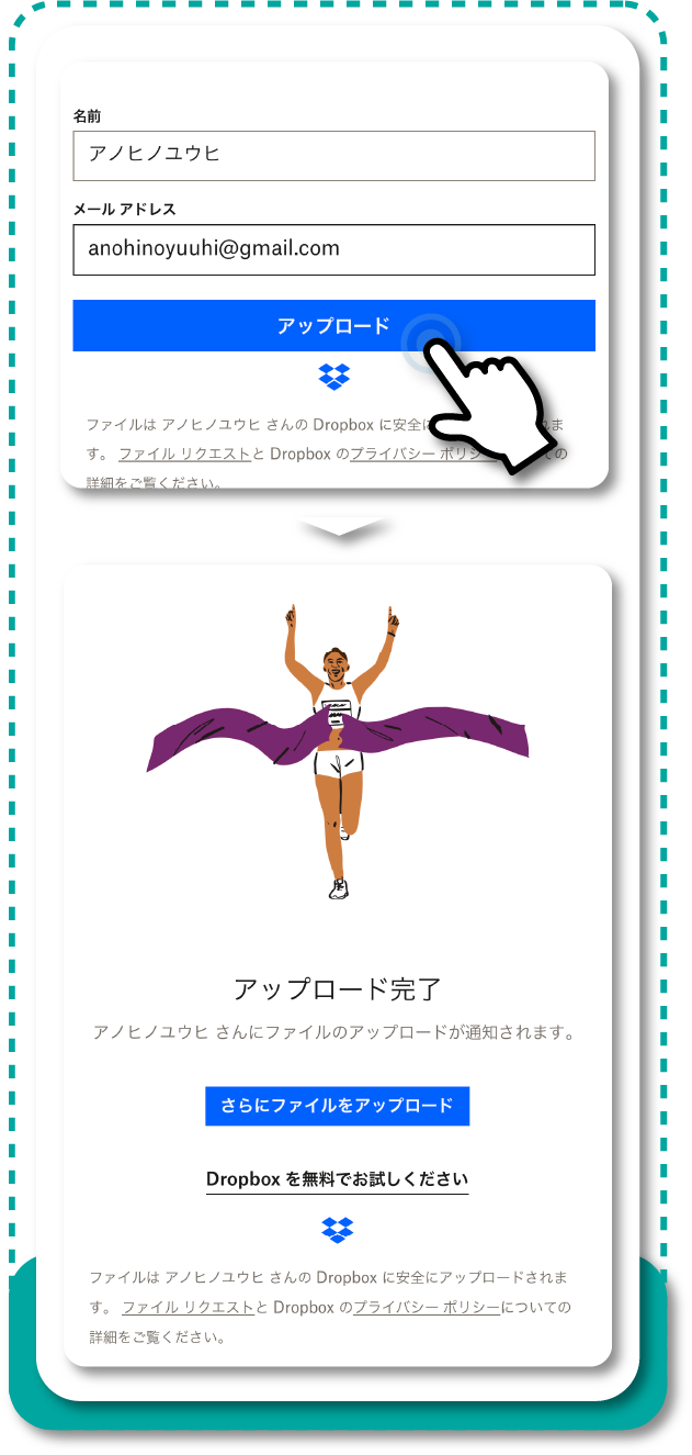 お名前とメールアドレスを入力して「アップロード」をタップ。あとはアップロードされるのをのんびり待てばできあがりです♪